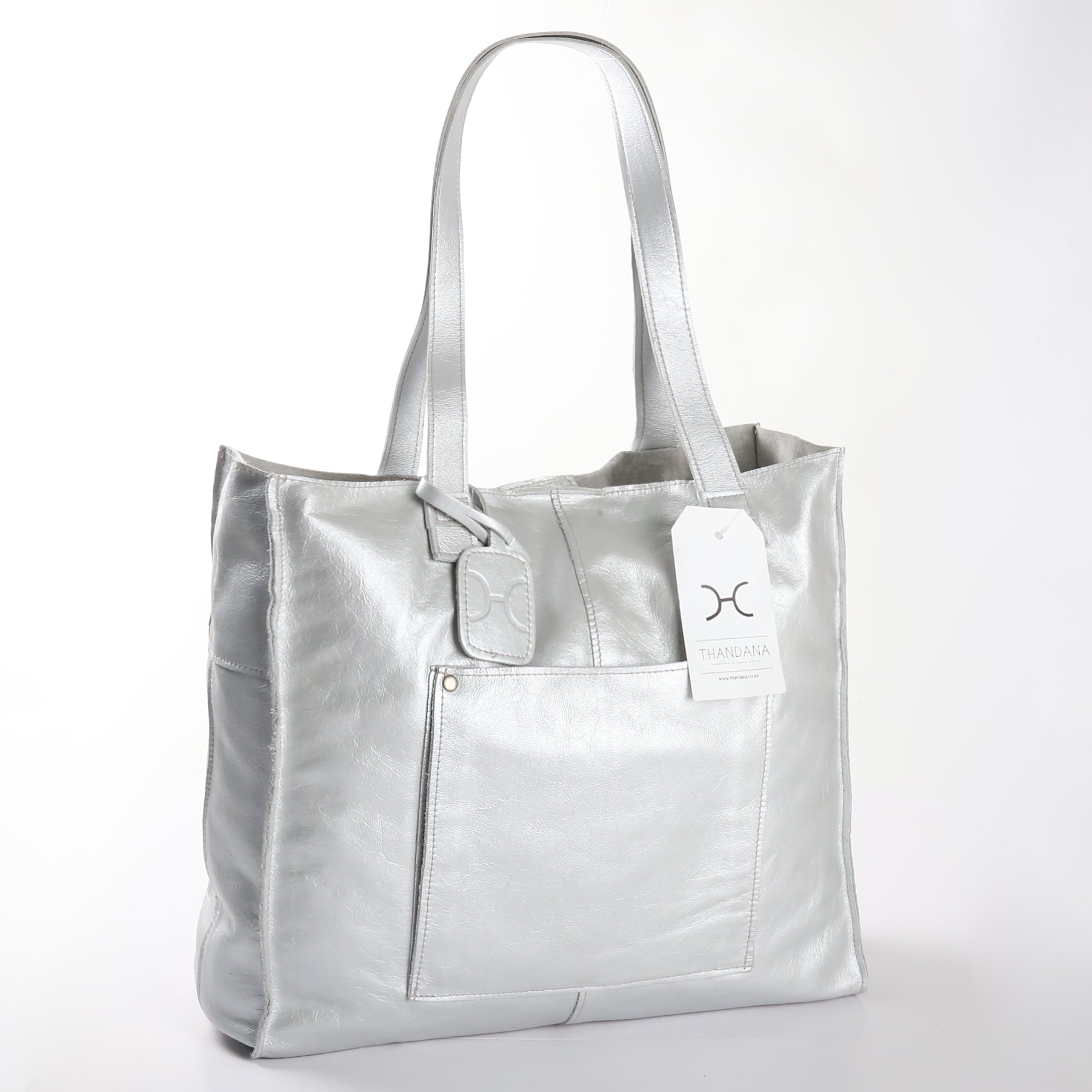 Step into the spotlight with the Metallic Leather Tote from Thandana. This slouchy, raw-edged handbag is not just a carryall—it's a statement. Crafted from genuine bovine leather with a metallic finish, it's designed for those who dare to stand out.